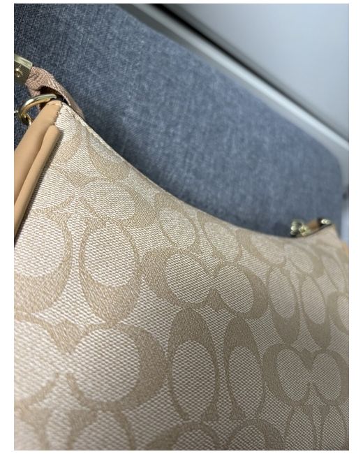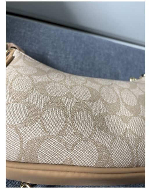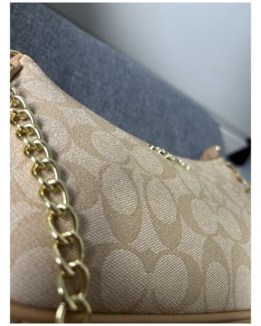 The Beige Coach Shoulder Bag is a stylish and practical accessory for women. With a rectangular shape and a small size, it is perfect for casual occasions. The bag features a zip closure, a shoulder strap in beige leather, and a pebbled finish. The exterior is made of leather in a coordinating beige colour, with accents of beiges zip and hardware. It also includes inner pockets for organization and comes with a detachable strap for added versatility. This designer bag from Coach is a timeless piece with a modern twist.