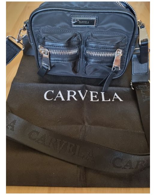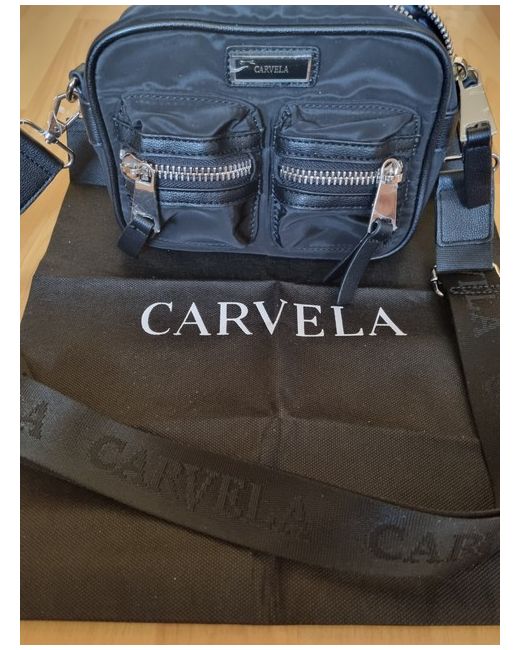 Carvela Black Small Camera Bag Two front pockets. Inside one zip pocket. Comes with dust Bag. Silver hardware.Length 8 inches Deprh 2.5 inches Height 6.5inches. Strap Length58 Inches crossbody, can be shortened to shoulder length.