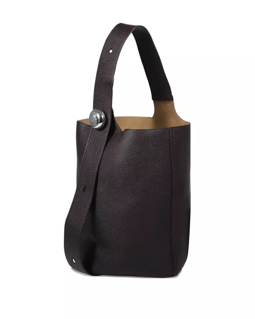 dark brown pebbled leather top handle button fastening single compartment leather strap