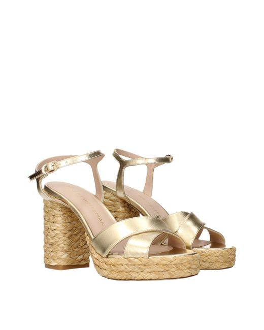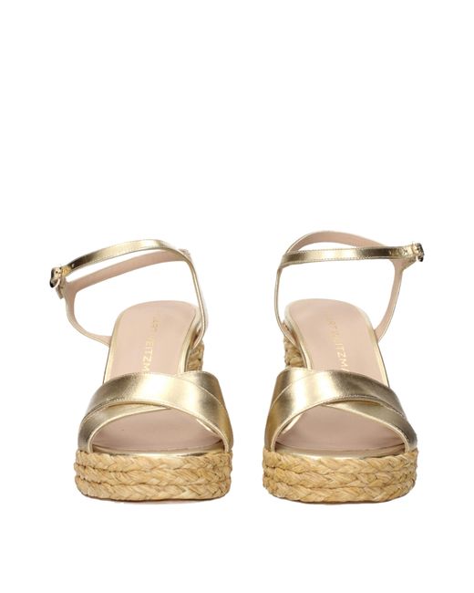Description: The product with MPN DAYNAPLATFORMLQASK878GOLDENNATURAL and code F84408 leather in gold is a sandals designed by Stuart Weitzman. It has features like metallic effect.
