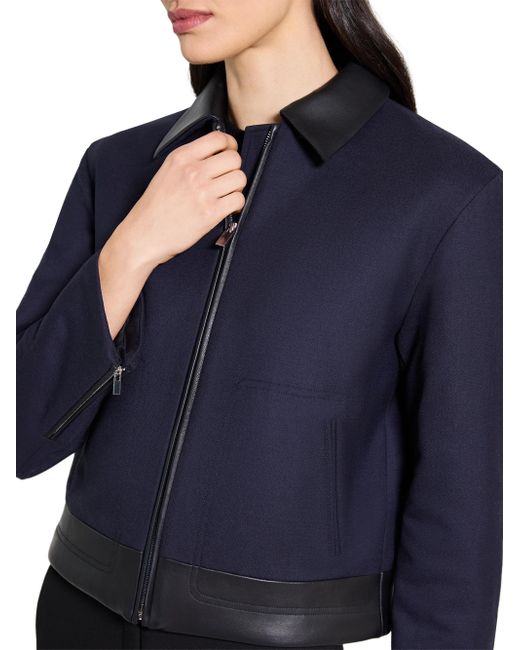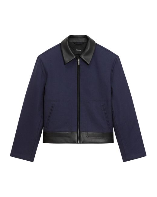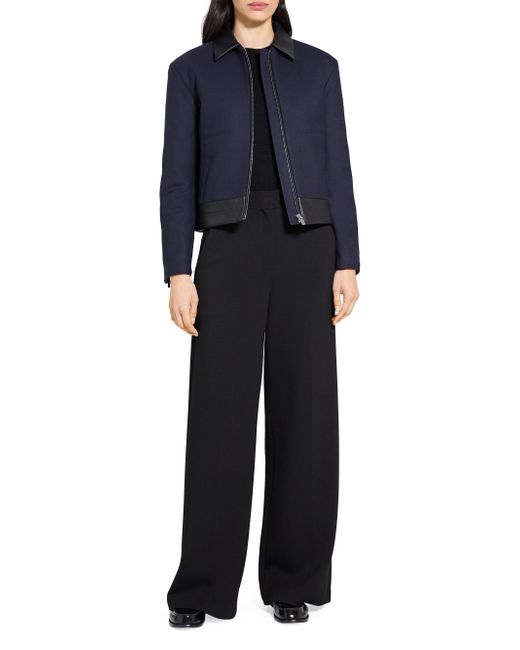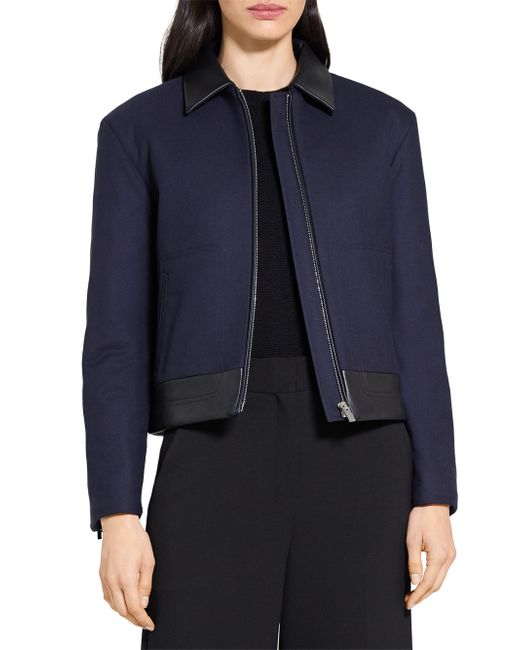 This Boxy zip-front jacket from Theory, crafted of a stretch wool blend, is styled with a spread collar, side welt pockets, and leather trim. Made with responsibly sourced wool Spread collar Long sleeves, zip cuffs Side welt pockets Front zip closure 40% respoonsibly sourced wool/29% polyester/28% viscose/3% spandex Lining: 40% responsibly sourced wool/29% polyester/28% viscose/3% spandex Dry clean Imported SIZE & FIT About 21" from shoulder to hem Model measurements: 5'10" tall Model is wearing a US size Small. Contemporary Sportswear - Theory Sportswear > Theory > Saks Fifth Avenue. Theory. Color: Dark Navy. Size: XS.