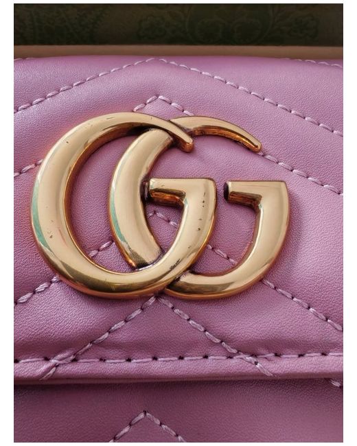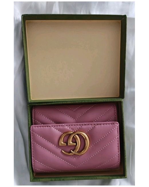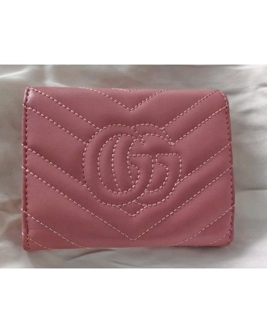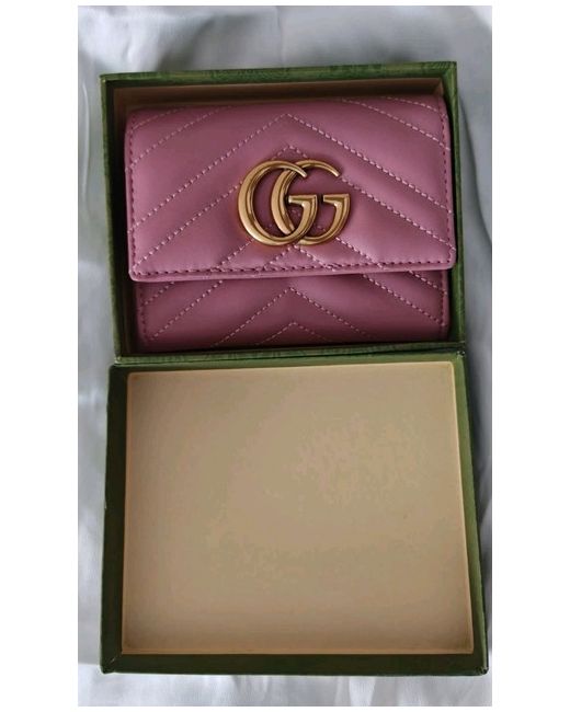 Gucci pink leather GG Marmont leather wallet. Gold metal GG - GUCCI logo on the front. it has a a minir defect, a light loss of gilding (gold paint) on the logo. The original box is damaged. Please check the photos carefully and ask if you need to know more details or if you have any doubts. GG logo stitched on the back. snap button closure. Inside it has 6 card slots, 3 open pockets, a bill compartment and 1 zip pocket for change. 'Gucci - Made in Italy' engraved inside Details. Measurements Height: approx 4 Inches - 10,2 cm Length: 5 Inches - 12.7 cm , Depth: 1 inch - 2,5 cm