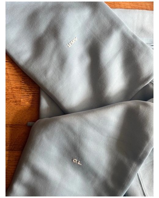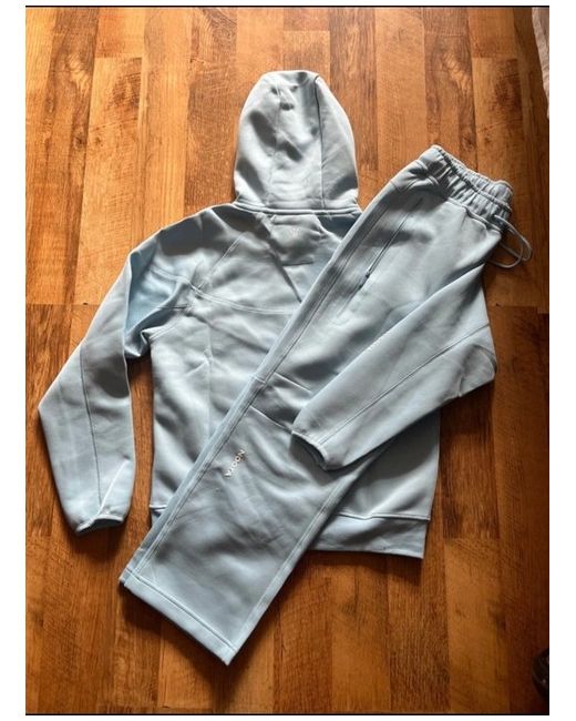 The Nike Nocta Tech Fleece in light blue is a 2-piece tracksuit set. Made from heavyweight cotton material, the set includes a hoodie and trousers with long sleeves and a zip accent detail. The machine washable pieces are in size L and feature the iconic Nike and Nocta brand logo, making them a stylish and comfortable choice for men looking for a quality tracksuit