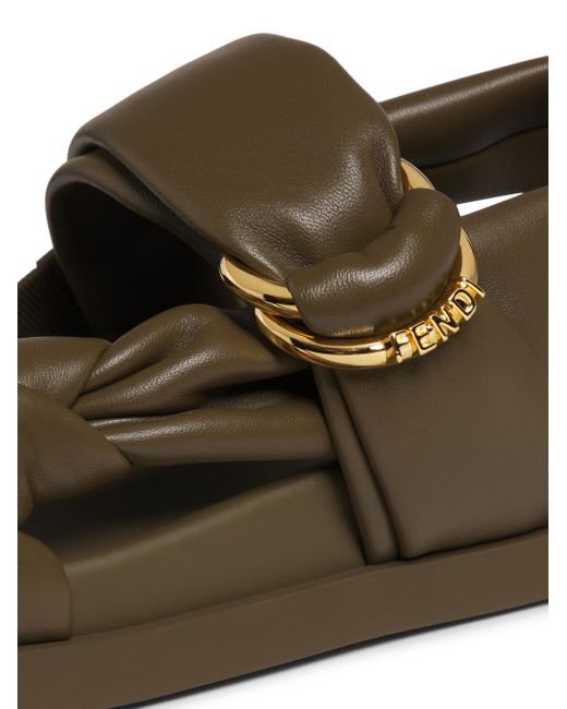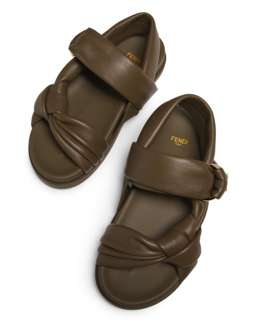 Made from soft Italian leather, Fendi's Fendi Feel Teva sandals feature a knotted strap with pleat details, a goldtone buckle, and a durable rubber sole. Open toe Buckle closure Leather upper Leather lining Rubber sole Made in Italy ABOUT THE BRAND The epitome of elegance and fine craftsmanship, Fendi was founded in 1925 in Rome by Adele and Edoardo Fendi. Today, Creative Director Kim Jones continues the house's emphasis on quality, tradition, experimentation and creativity. Women's Shoes - Fendi Womens Shoes > Fendi > Saks Fifth Avenue. Fendi. Color: Olive. Size: 5.