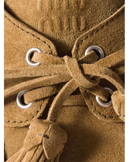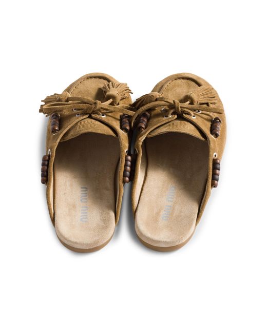 Upper threaded with wooden beads and suede leather tassels Logo embossed on the tongue and screen-printed on the insole Rubber sole Imported 100% Calf leather. Lsd Handbags - Miu Miu > Miu Miu > Saks Fifth Avenue. Miu Miu. Color: Beige. Size: 6.