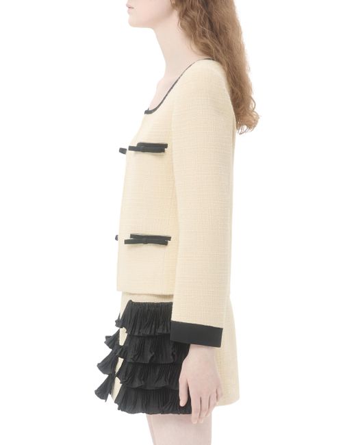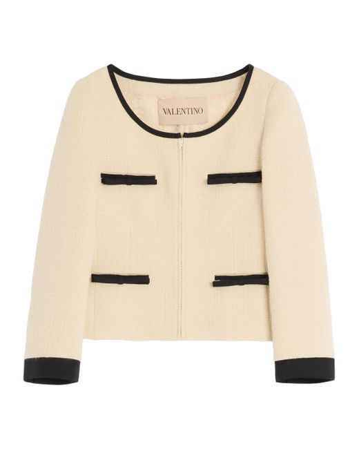 Plain Wool Tweed jacket with contrasting Crepe Couture bows. Wide neckline Front zipper closure Plain Wool Tweed (97% Virgin wool, 3% Polyamide) Lining with flowers, stripes and VLogo (74% Acetate, 26% Silk) Length: 54 cm / 21.2 in. from the shoulders in an Italian size 40 The model is 176 cm / 5'9'' tall and wears an Italian size 40 Made in Italy. Lsd Rtw - Valentino Rtw > Valentino Garavani > Saks Fifth Avenue. Valentino Garavani. Color: Almond Black. Size: 2.