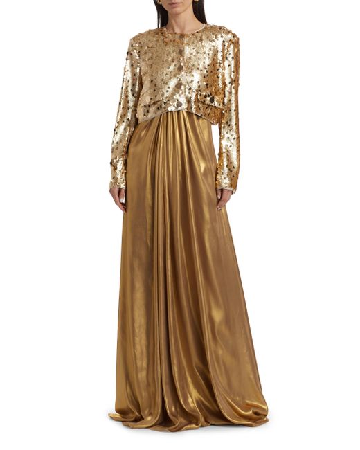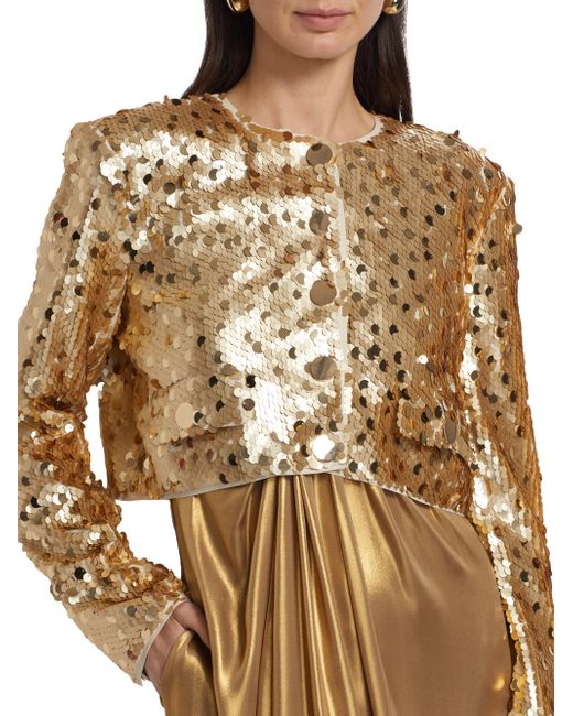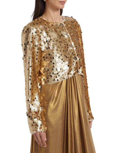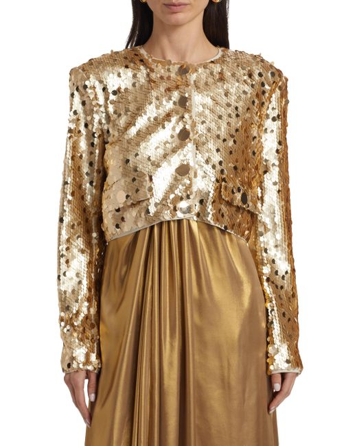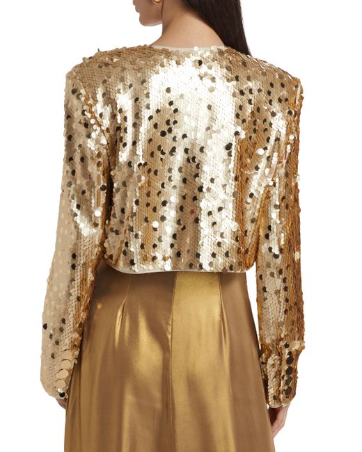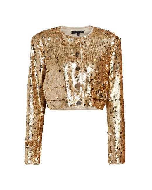 Toccin's Jones jacket is adorned with large-scale paillette sequins and cut for a cropped length. Crewneck Long sleeves Side button-through flap pockets Button-front closure 100% polyester Hand wash Imported SIZE & FIT About 17" from shoulder to hem Model measurements: 5'10" tall Model is wearing a US size 4. Modern Collections - Branded Separates > Toccin > Saks Fifth Avenue. Toccin. Color: Brushed Gold. Size: 2.