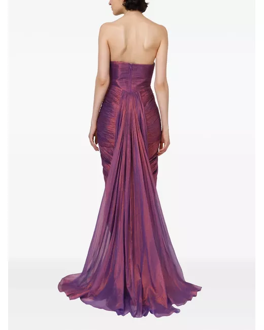 purple silk strapless pleated bodice bow detail draped skirt floor-length