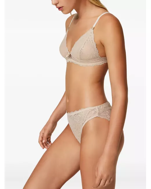 beige lace fabric triangle shape bow detail adjustable straps hook fastening Just a reminder that this piece must be tried on over your own garments.