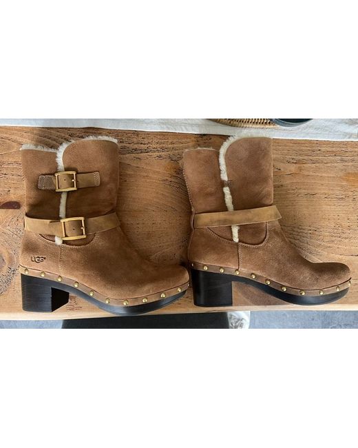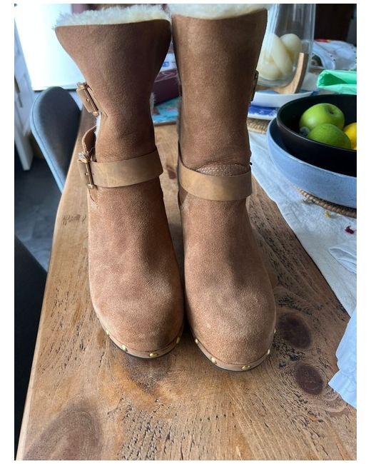 Women's Ugg boots with heel. Suede outer and lined fur inside. Brand new and never worn. There is one small circle mark on the mark on the the toe defect as shown in picture.