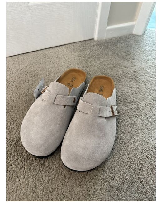 The product is a pair of size 10 grey suede slip-on clogs by Birkenstock. These unisex adult sandals are known for their comfort and durability, making them a stylish and practical choice for everyday wear. With a sleek design and versatile grey colour, these clogs are perfect for adding a touch of style to any outfit.