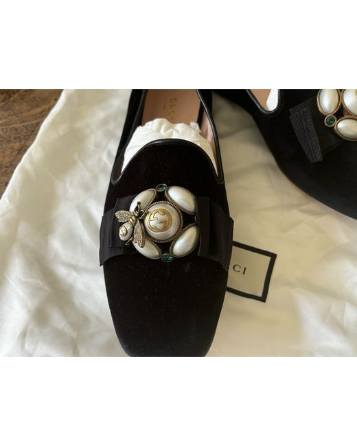 These Gucci flats are in perfect condition , with a little wear to the sole where they have been tried on. The buckle detail is as well made as jewellery , with a leather lining and a velvet upper with a ribbon bow.