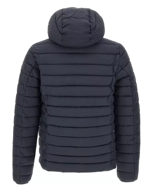navy blue horizontal quilted pattern full zip front fixed hood side zip pockets chest pocket