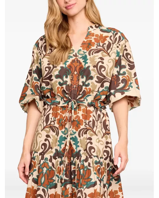beige damask print drawstring hem V-neck balloon sleeves button fastening