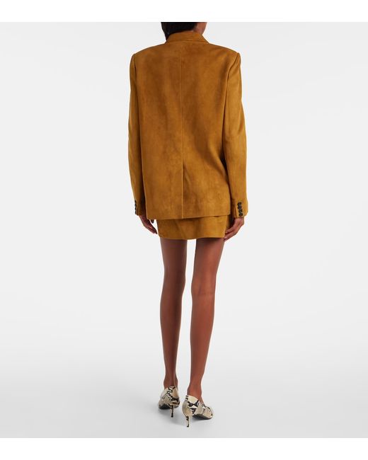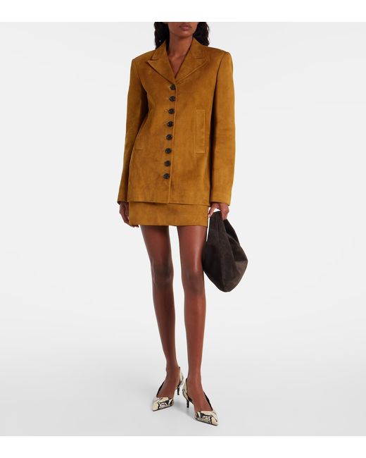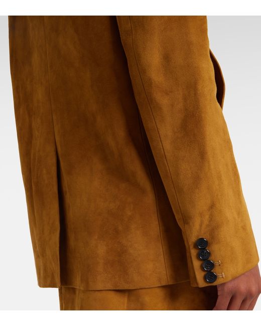 Material: 100% lamb leather (suede). Care instructions: specialist clean. Made in the USA. Designer color name: Toffee. Item color: brown. Peak lapel. Shoulder pads. Closure: buttoned front. Pockets: welt pockets. Cuff: four buttons. Fully lined. Leather.