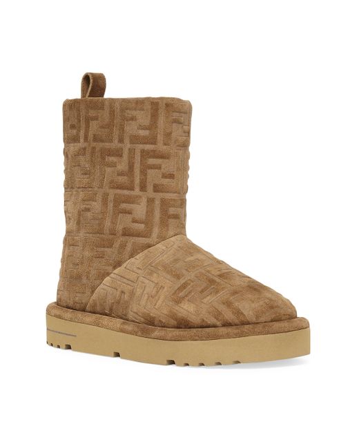 Fendi's suede ankle boots feature an allover FF logo and a back pull tab for easy wear. The shearling lining ensures warmth, while the rubber lug sole provides grip and durability. Round toe Pulls on Suede upper Shearling lining Rubber sole Fur type: dyed shearling Fur origin: Spain Made in Italy SIZE & FIT Heel: about 1" (25mm) ABOUT THE BRAND The epitome of elegance and fine craftsmanship, Fendi was founded in 1925 in Rome by Adele and Edoardo Fendi. Today, Creative Director Kim Jones continues the house's emphasis on quality, tradition, experimentation and creativity. Women's Shoes - Fendi Womens Shoes > Fendi > Saks Fifth Avenue. Fendi. Color: Tabacco. Size: 6.5.