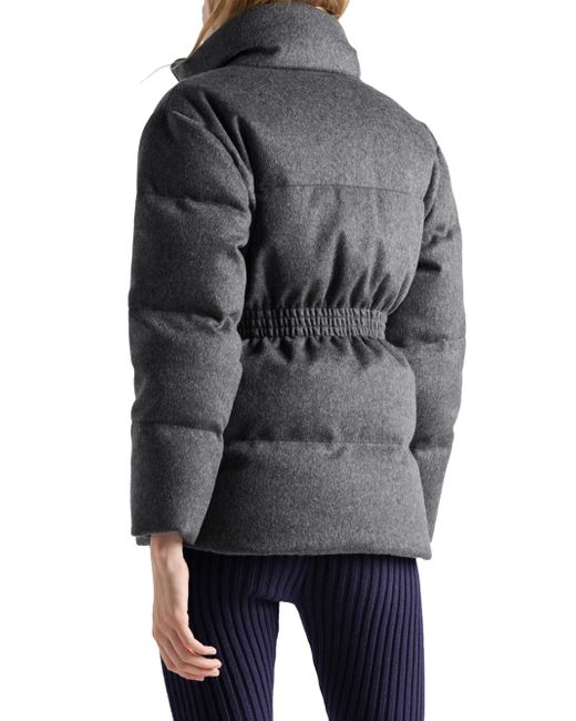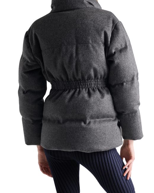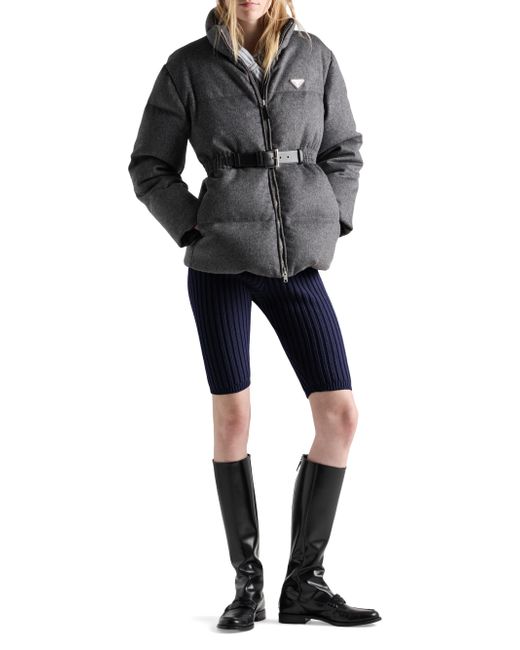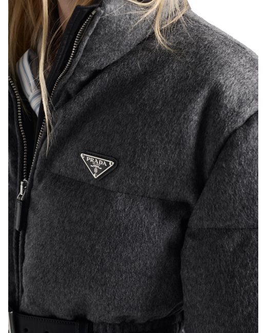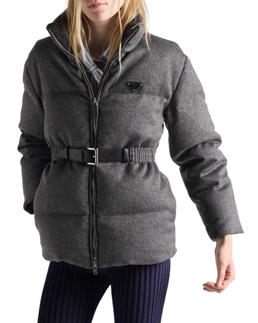 Relaxed fit - The garment fits up to one size larger Goose down padding Stand-up collar Long sleeves Straight cuff Zipper closure Fabric triangle logo Internal pocket with button Leather belt Lined garment Elasticized waist Inseam pockets Made in Italy 100% fleece wool, 100% calf leather. Lsd Rtw - Prada Rtw > Prada > Saks Fifth Avenue. Prada. Color: Grey. Size: 0.