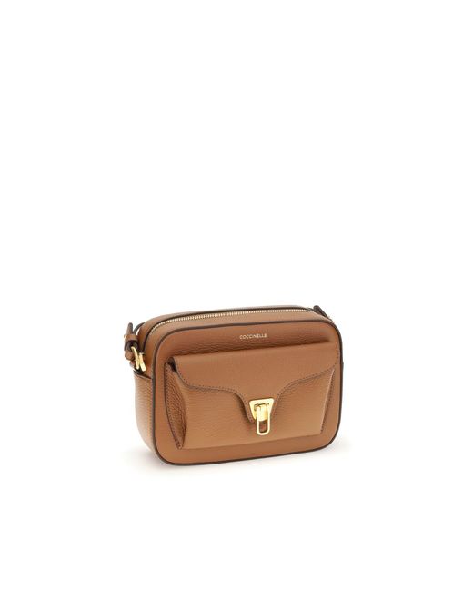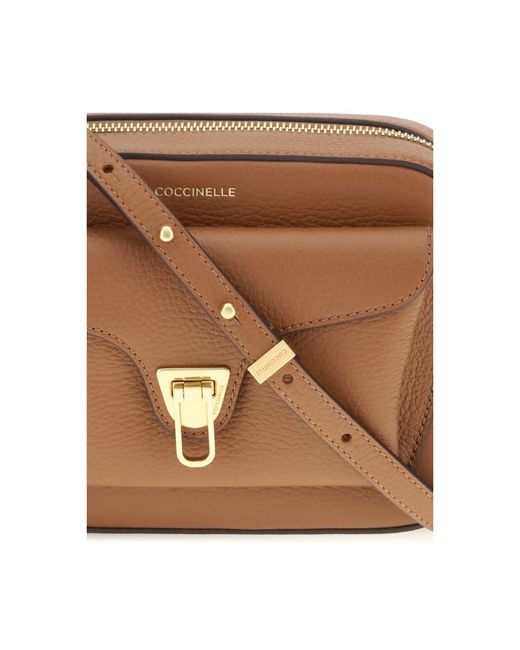 Calfskin Beat Soft Shoulder Bag by Coccinelle, top zip fastening, removable and adjustable flat leather shoulder strap, iconic brand monogram printed in contrasting pressure on the front, front patch pocket with flap fastening and gold-plated metal interlocking system, garnet leather design. Season: AW25 Dimension: 21x21x7 Composition: GENERAL 100% Calf Leather Bos Taurus MADE IN ITALY