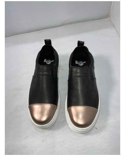These Dr. Martens AirWair slip-on trainers are a stylish and comfortable choice for women in UK size 4. Featuring a round toe shape and slip-on closure, they are made from black leather with gold and white accents. The elastic feature adds flexibility and ease of wear, making them perfect for everyday wear. Made by the iconic brand Dr. Martens, these shoes combine durability with a modern slip-on style, making them a versatile addition to any wardrobe.