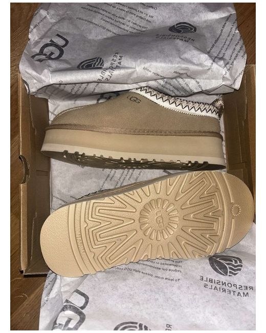 The UGG Tasman Women's Slipper is a stylish and comfortable choice for casual wear during the winter season. With a low heel height and slip-on closure, these brown suede slippers feature a round toe and signature UGG logo accents. Made with wool insoles for added warmth, these platform-style slippers are perfect for lounging around the house or running quick errands. The standard shoe width and quality craftsmanship from UGG Australia make these slippers a reliable and fashionable addition to any woman's wardrobe. Perfect condition size uk4
