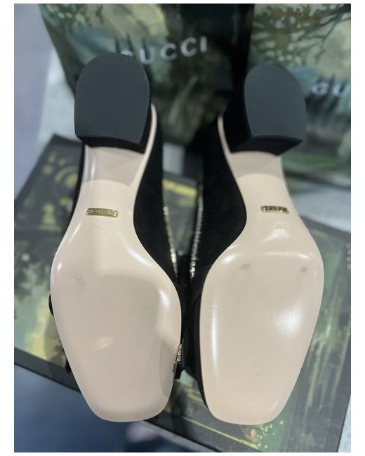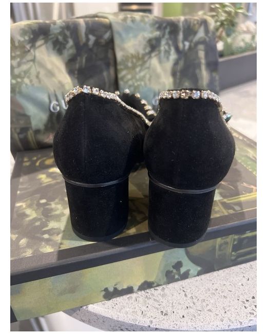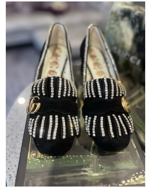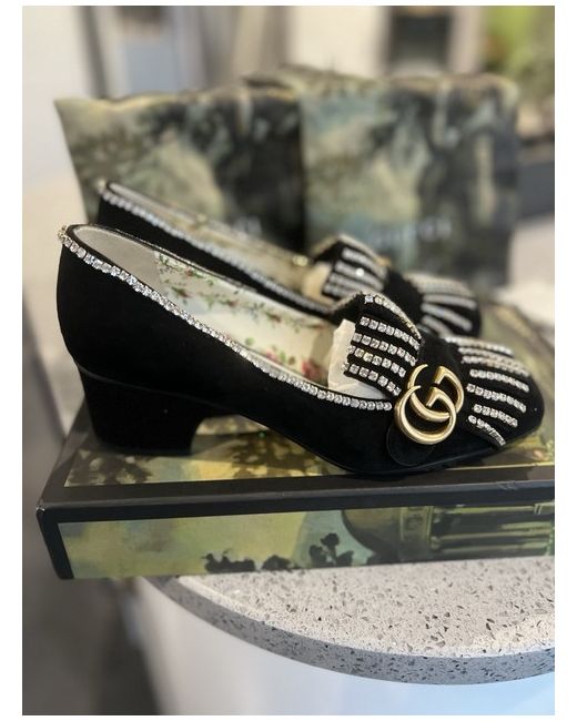Very rare Gucci Marmont low heel in Black suede, adorned with diamante, with gold GG and detailing. Size EU 38.5 UK 5.5 US 8. Heel height 2"/ 5cm These shoes are stunning and sparkle beautifully, difficult to capture in a photo. In perfect condition. Never worn, only tried on and unfortunately, too small for me. Comes with original dust bags and box.