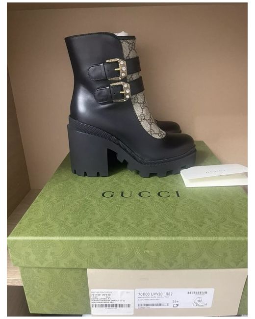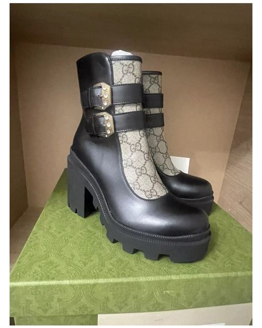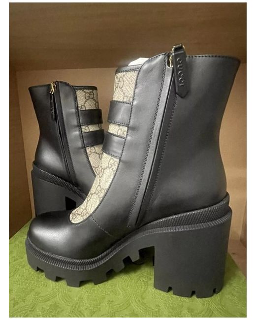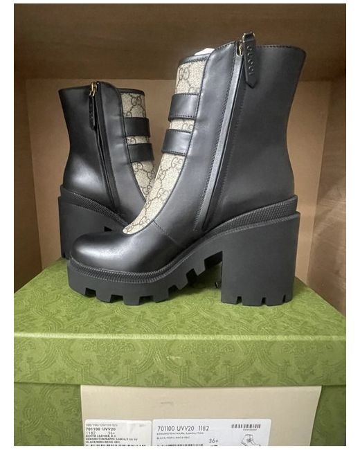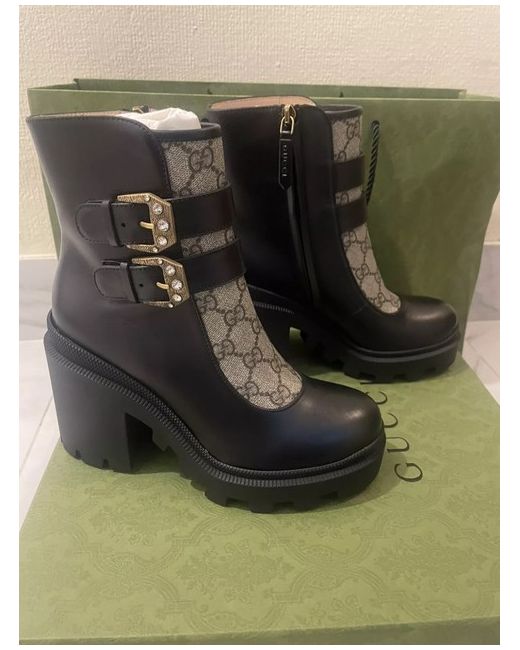 The Gucci Leather GG Print Ankle Boots in Black are a stylish and sophisticated choice for any woman's wardrobe. Made in Italy from high-quality leather, these boots feature a round toe, zip closure, and a comfortable block heel. The iconic Gucci logo adds a touch of luxury to the classic black design, making them a versatile and fashionable option for any outfit. With a UK size 3.5 (EU 36.5), these boots are a perfect blend of elegance and comfort for any fashion-forward woman. New never been used RRP £895