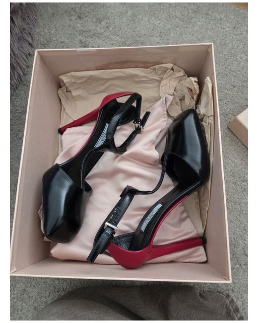 Prada Court Square Toe Block Heel Leather Shoes Black & Red Size UK 4.5. Condition is New with box. Dispatched with Royal Mail Special Delivery (TM) 1:00 pm.