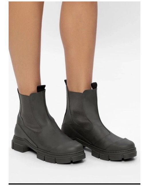 The GANNI City Boots in Kalamata are a stylish slip-on boot designed for women in UK size 5. Made from rubber with a green colour, these boots feature a modern city-inspired theme. The Ganni brand is known for its distinctive and trendy designs, making these boots a fashionable choice for those looking for a unique and comfortable footwear option.