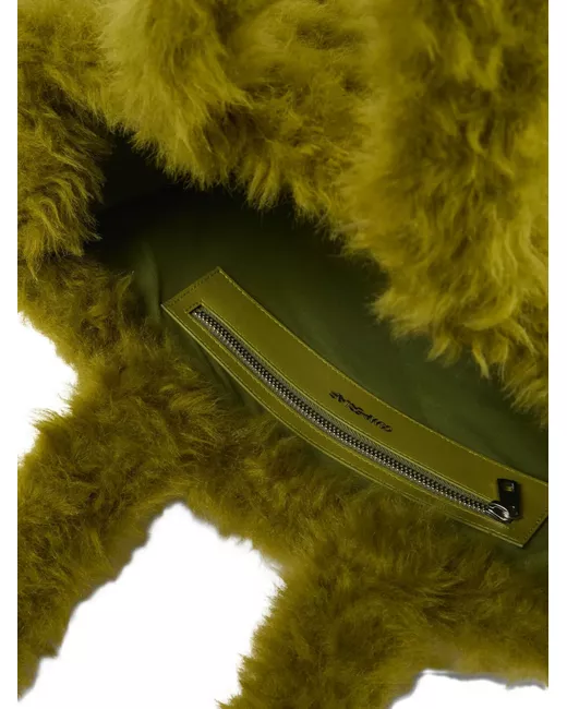 green shaggy texture top handles internal zip pocket rectangular shape fully lined
