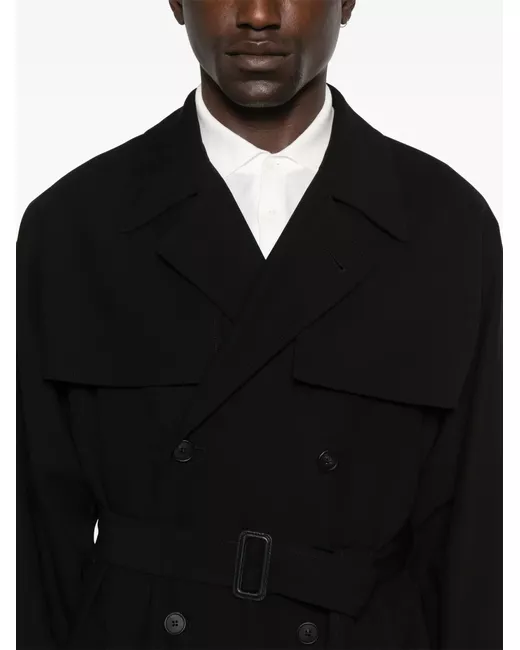 black double-breasted closure belted waist long sleeves notched lapel straight hemline