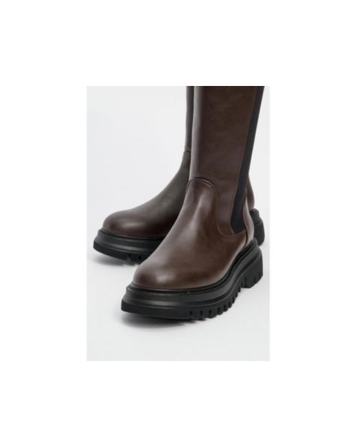A sleek over-the-knee boot with a faux-leather and stretch fabric upper, featuring a comfortable block heel for all-day wear.