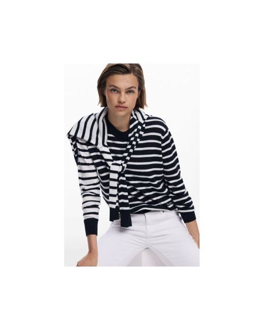 Fine long-sleeve sweater with a round neck, featuring a two-tone horizontal stripe print and embroidered logo detail.