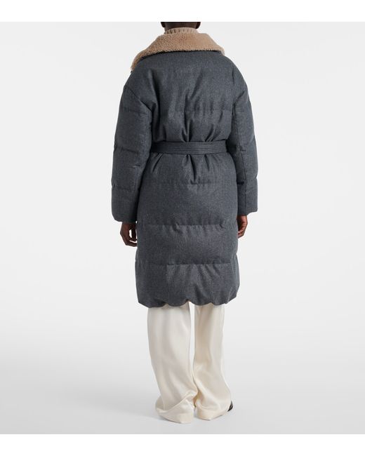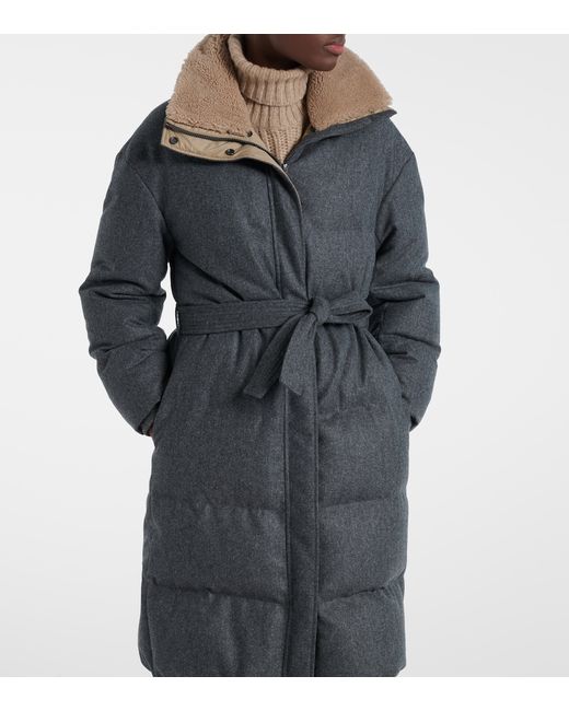 Material: 100% virgin wool. Care instructions: dry clean. Made in Italy. Designer color name: Grigio Scuro. Item color: gray, brown. Material II: 100% shearling. Interlining: 100% cashmere. Lining: 100% nylon. Insert: 100% brass. Separate lining slip: 100% polyamide. Filling: 100% polyester. Filling II: 90% down, 10% feathers. Contains non-textile parts of animal origin. Closure: two-way zipped front with snap-button fastenings. Collar: turtleneck. Detachable collar. Cuff: ribbed. Belt loops. Detachable belt. Pockets: side slit pockets. Hem: elasticated. Wool.