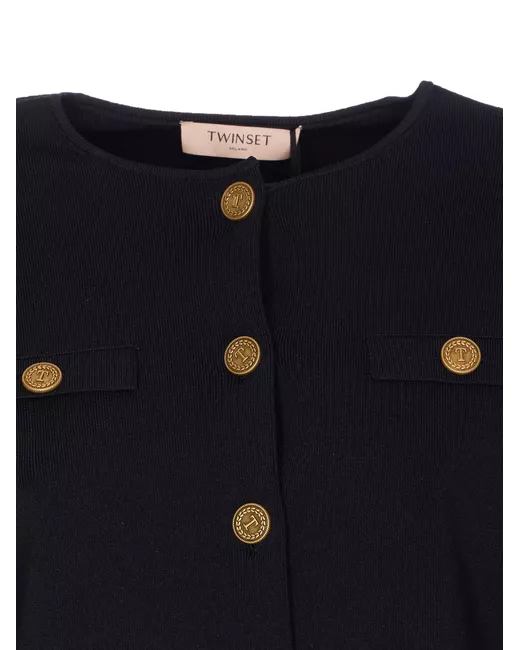 black front button closure crew neck long sleeves reinforced shoulder scalloped hem