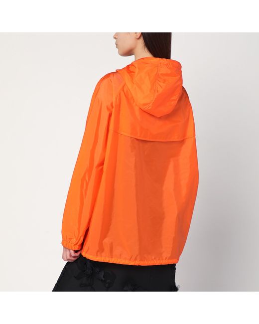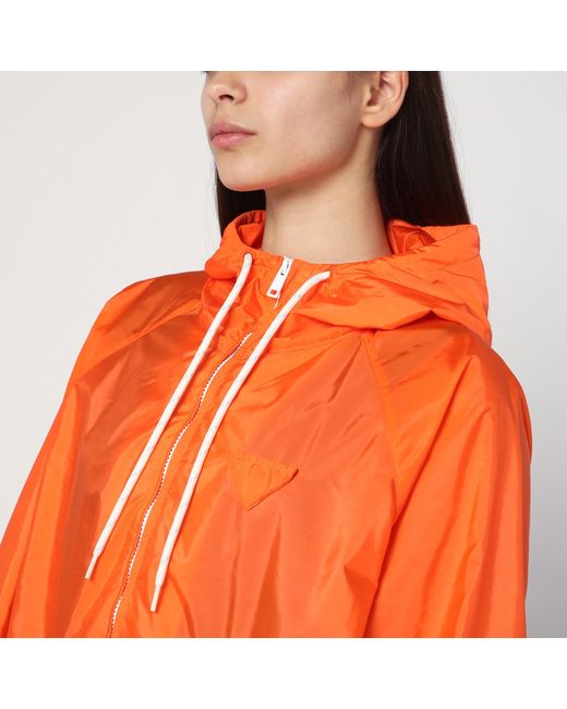 Prada waterproof jacket in orange Re-Nylon, featuring a hood with drawstring, long sleeves with elastic cuffs, front zip closure, two side zip pockets, drawstring hem, and a tone-on-tone fabric logo triangle on the chest.