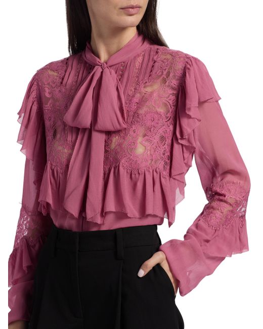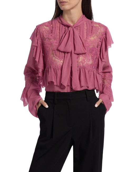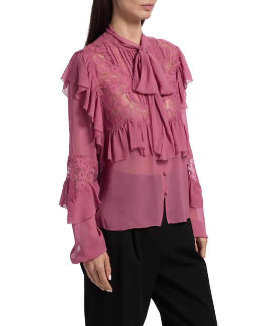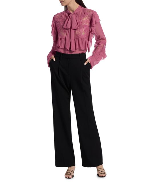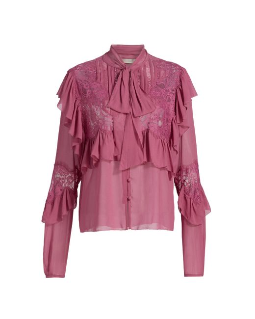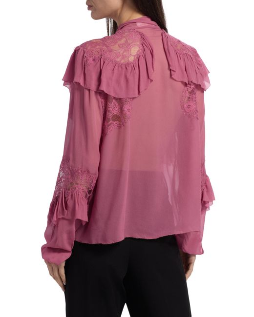 This Farah top from LoveShackFancy, crafted of chiffon, is designed with a tieneck, romantic lace, and ruffles. Tieneck Long sleeves Button-front closure 100% viscose Dry clean Imported SIZE & FIT About 23.5" from shoulder to hem Model measurements: 5'10" tall Model is wearing a US size Small. Contemporary Sportswear - Trend > Loveshackfancy > Saks Fifth Avenue. LoveShackFancy. Color: Deep Rose. Size: XXS.