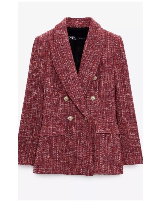 The product is a 100% authentic ZARA red double-breasted blazer, crafted from textured weave tweed material in size XS. This stylish overcoat is designed for women and features a striking red colour with metallic accents, making it a fashionable and versatile addition to any wardrobe. With its premium fabric and sophisticated style, this blazer is sure to elevate any outfit with its classic yet contemporary design.
