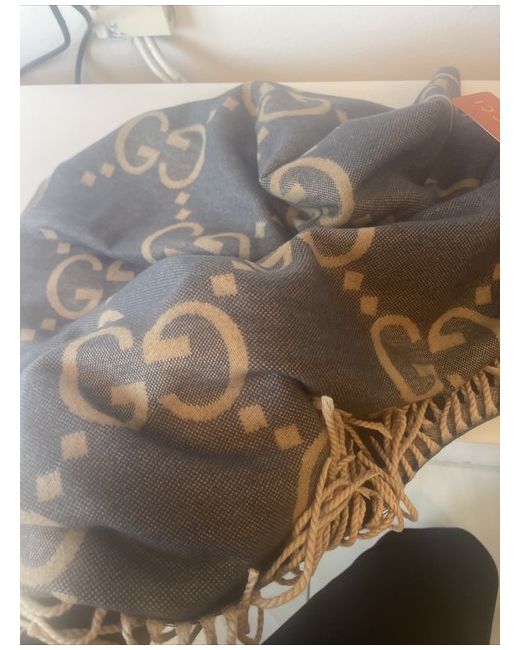 The Gucci GG Scarf is a luxurious accessory crafted from wool, featuring the iconic Gucci logo as an accent. This beige rectangle scarf is designed for winter, serving as a stylish neck warmer for women. Made in Italy, this high-quality scarf is a perfect addition to any winter wardrobe, adding a touch of elegance and sophistication to any outfit. The Gucci brand ensures both style and quality, making this scarf a must-have for those who appreciate luxury fashion.