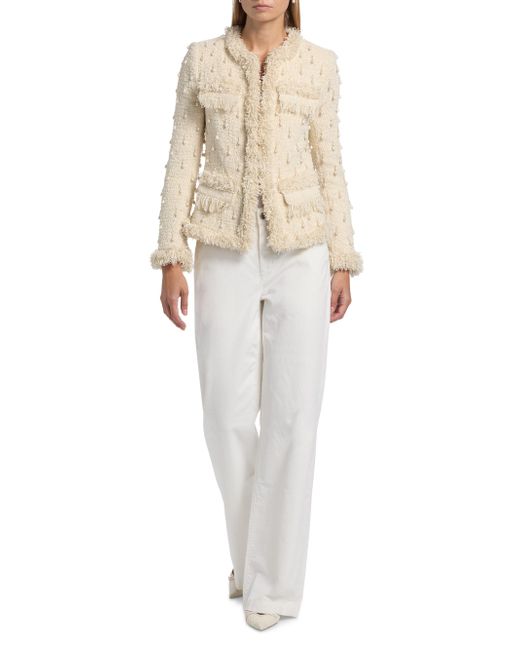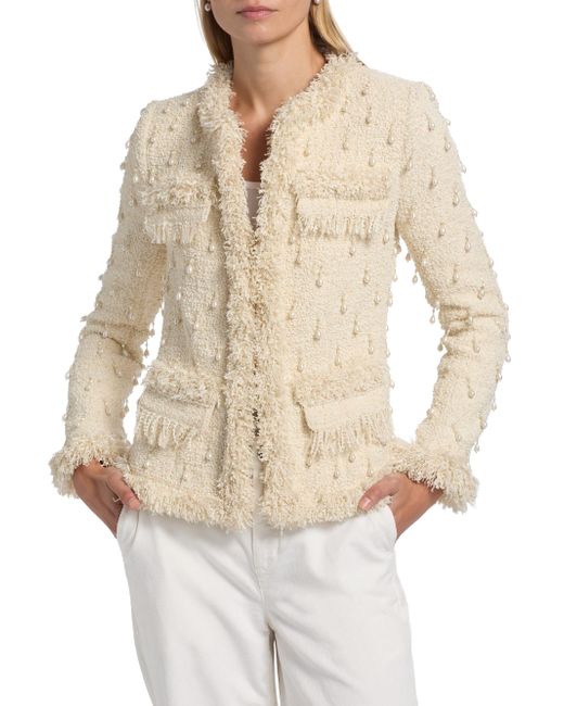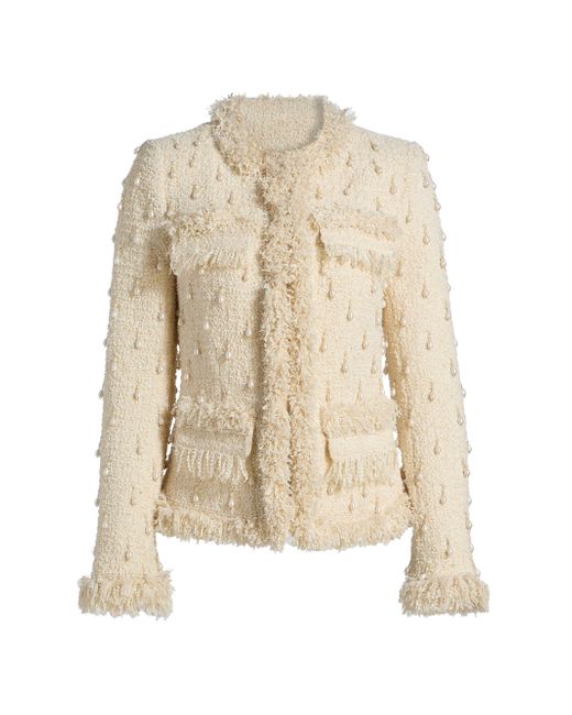 ONLY AT SAKS. Kobi Halperin's Hana jacket is crafted of solid boucle tweed and embellished with faux pearl teardrop beading. Voluminous fringe details the collar, flap pockets, and trim of this style for a dramatic finish. Crewneck Long sleeves Chest and side flap pockets Fringe trim Concealed front hook-and-eye closure 100% polyester Dry clean Imported SIZE & FIT Model measurements: 5'10" tall Model is wearing a US size Small. Modern Collections - Kobi Halperin > Kobi Halperin > Saks Fifth Avenue. Kobi Halperin. Color: Ivory. Size: XS.