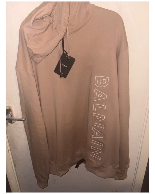 The Balmain Embossed Hoodie in beige is a stylish and luxurious addition to any man's clothing collection. This large-sized pullover hoodie features a drawstring closure and a hood for ultimate comfort and warmth. The Balmain logo embossed on the front adds a touch of high-end fashion to this versatile wardrobe staple. Perfect for casual activewear or relaxed everyday wear, this hoodie is a must-have for those looking to make a statement with their style.