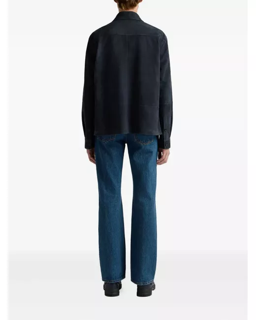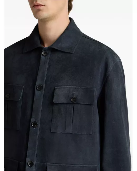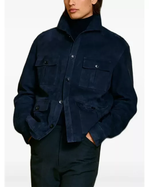 navy blue suede button fastening front flap pockets spread collar