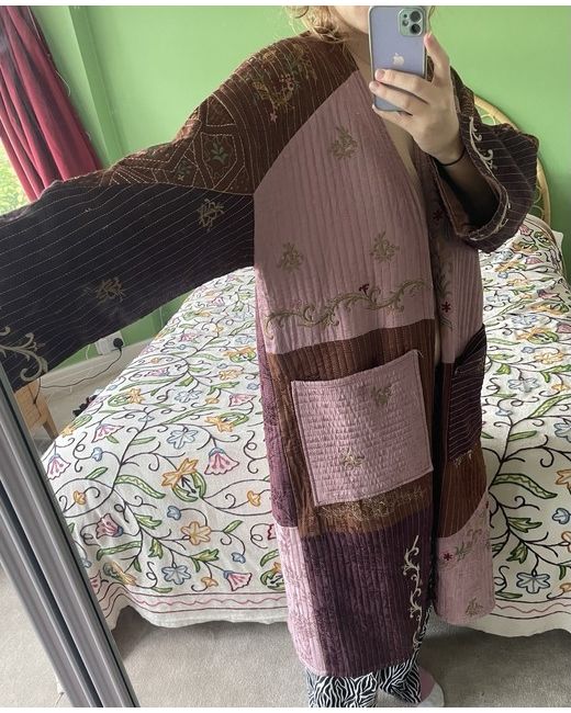 Can be worn as a casual jacket, festival evening or as a dressing grown. Very warm and oversize fit means you can get extra cosy with a layer underneath. Worn in the house only. The stitching around the pocket has come undone but can easily be fixed.