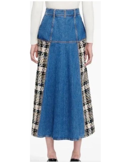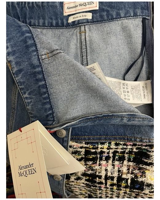 Alexander McQueen Colourful Tweed texture Panel Contrast Denim Skirt in size 44/12 . A stylish midi skirt made from a cotton blend denim fabric, asymmetric waist. The skirt features a side zip closure and front bottom embellished. The bold blue colour and tweed panel details add a touch of spring-inspired flair to any outfit. Materials: 37% cotton, 25% acrylic, 14%polyamide, 13% wool, 9% viscose, 2% polyester. Measurements: appx Waist: 15in Length: 34in Condition never been used with tags.