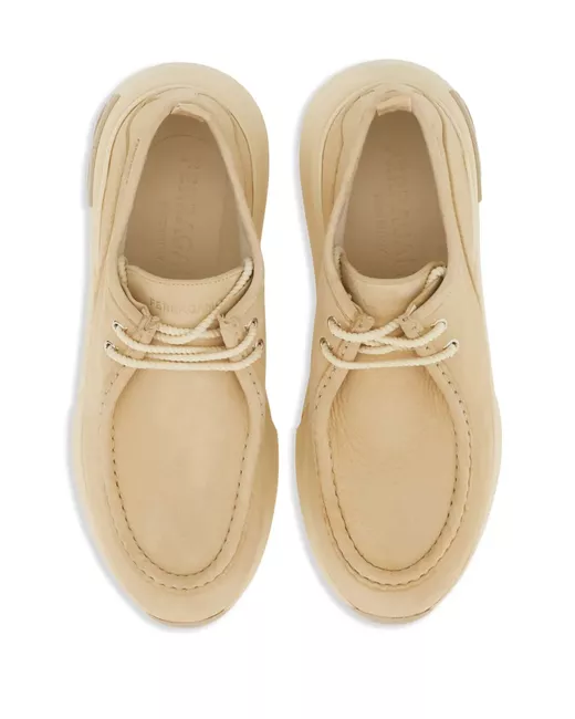 Écru, nubuck, applicazione laterale con logo, cuciture decorativa, punta smussata, chiusura frontale con lacci, soletta con logo e suola chunky in gomma.
