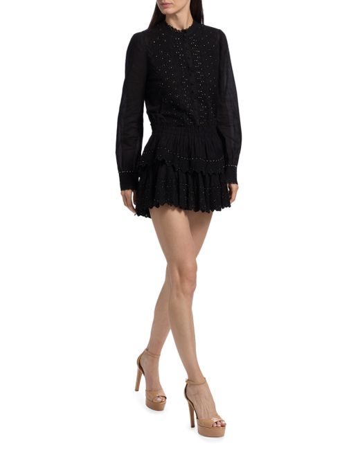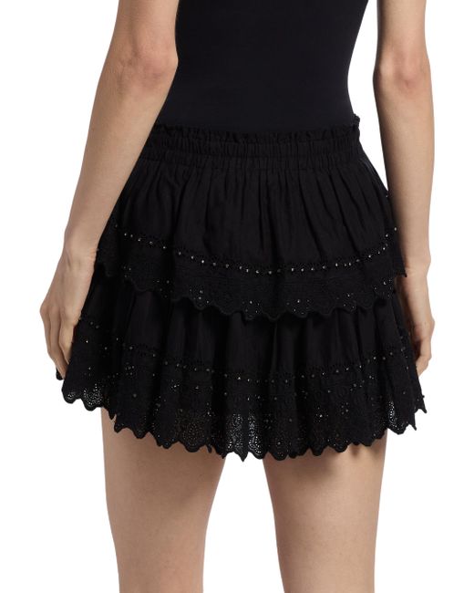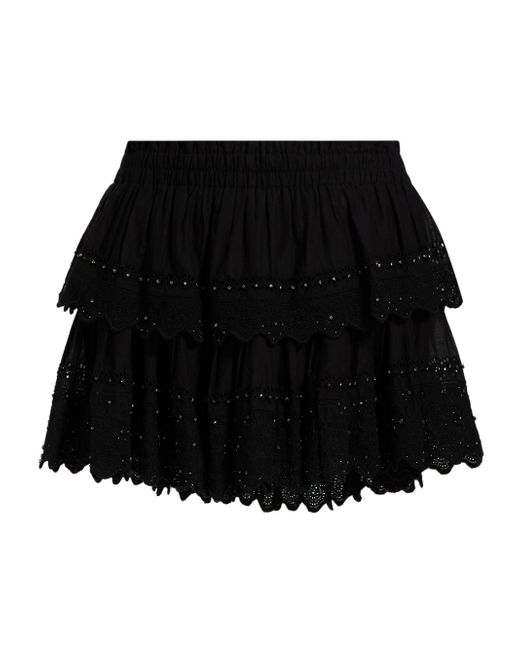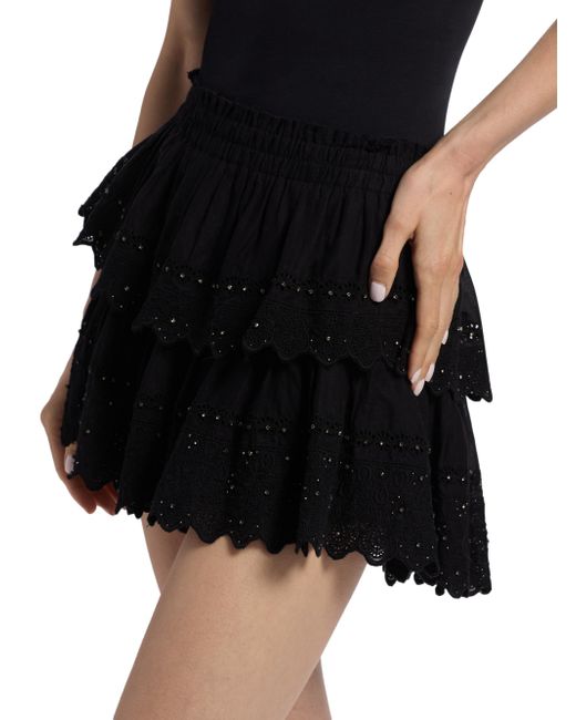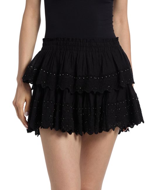Crafted of soft cotton, this miniskirt from LoveShackFancy is designed with a tiered playful hem and sparkling crystal embellishments. Elasticized waist Scalloped hem Pulls on 100% cotton Dry clean Imported SIZE & FIT About 11" long Model measurements: 5'10" tall Model is wearing a US size Small. Contemporary Sportswear - Trend > Loveshackfancy > Saks Fifth Avenue. LoveShackFancy. Color: Black. Size: XXS.
