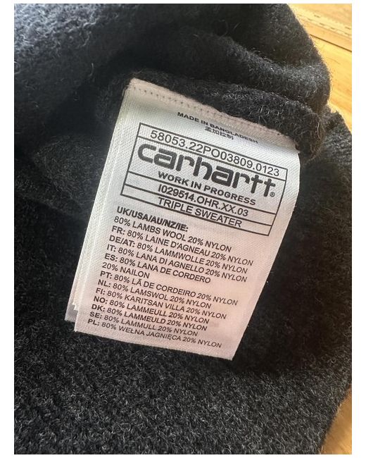 This Carhartt Work In Progress men's lambswool blend sweater features a classic crew neck design. The body of the sweater is black with contrasting khaki sleeves and dark grey back showcasing a modern three-tone style. Measurements in photos Crafted for comfort and durability, it is perfect for casual or workwear use. Includes original tags, size Medium. A versatile addition to any wardrobe, blending style with function. #Carhartt #MensSweater #Workwear #CrewNeck