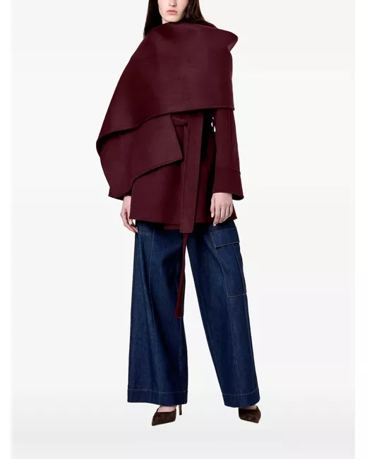 dark plum wool blend belt shawl collar cuff detail long sleeves