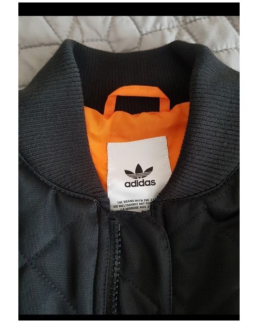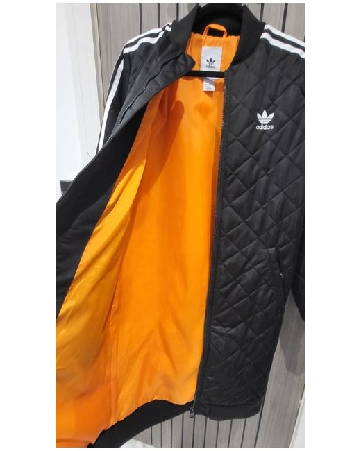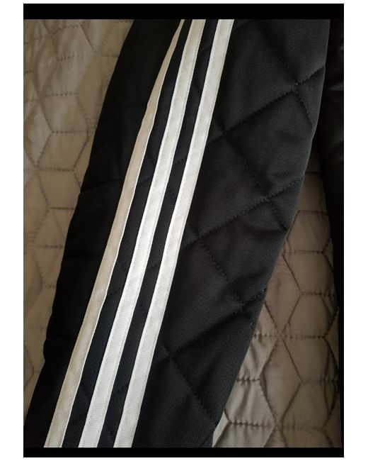 This Adidas women's long bomber jacket in black features a regular fit and a polyester outer shell. It is a size 8 with a polyester lining, suitable for everyday wear. The style is a classic bomber jacket design, ideal for adding a sporty edge to your outfit.