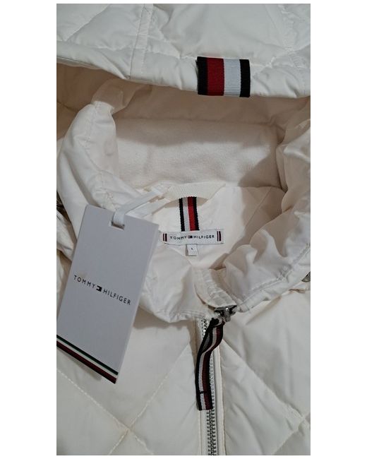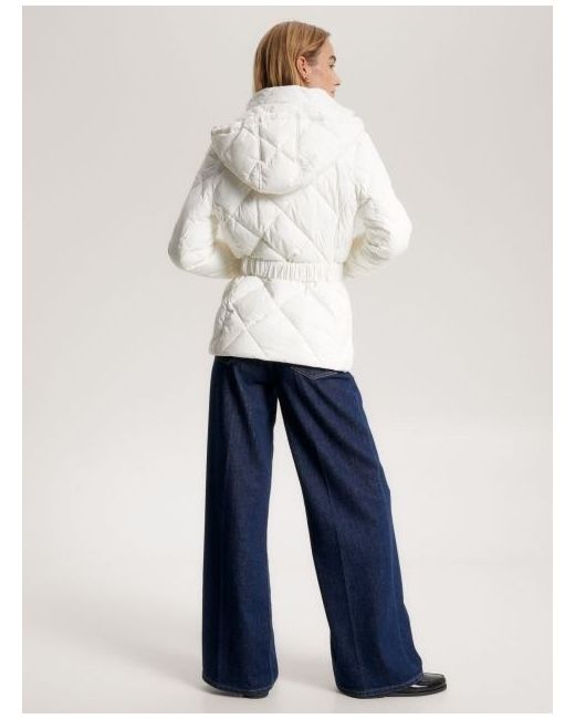 Composition 56% recycled polyester, 44% polyester Sorona® filling Highlights Recycled polyester blend Padded Non-removable hood Funnel neck Zip-thru Belted waist Two waist zipped pockets Tommy Hilfiger branding Tommy Hilfiger flag embroidery on sleeve