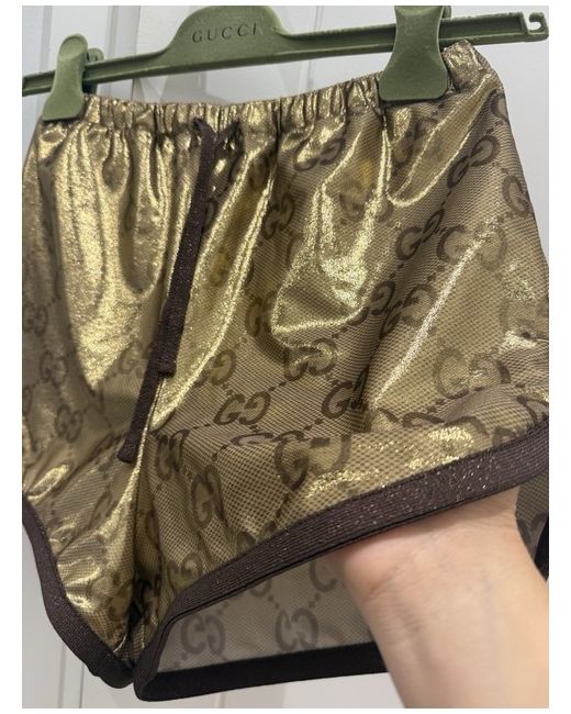 New with tags Retailing for £800 Measured with and without stretch Gucci metallic monogram drawstring shorts Made in Italy Highlights gold-tone jersey knit metallic effect Maxi GG canvas contrasting trim drawstring waist thigh-length Composition Polyamide 80%, Elastane 20% Trims: Viscose 66%, Metallic Fibre 17%, Elastane 2%
